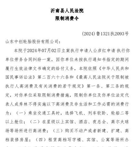 追溯至今年7月,沂南縣人民法院已對山東中創(chuàng)輪胎股份有限公司發(fā)出限制消費(fèi)令。據(jù)令文顯示,自2024年7月2日起,因該公司未能按照執(zhí)行通知書規(guī)定的期限履行法律文書確定的支付義務(wù),法院依據(jù)《中華人民共和國民事訴訟法》第二百六十六條及《最高人民法院關(guān)于限制被執(zhí)行人高消費(fèi)及有關(guān)消費(fèi)的若干規(guī)定》第一條、第三條的規(guī)定,對山東中創(chuàng)輪胎股份有限公司及其法定代表人成秀林實施限制消費(fèi)措施,禁止其進(jìn)行非生活和工作必需的高消費(fèi)行為。