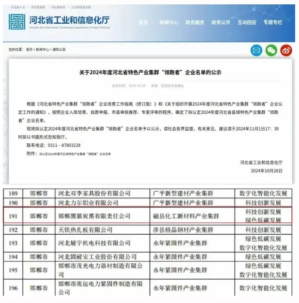 【炭黑產(chǎn)業(yè)網(wǎng)】11月6日消息,近日,河北省工業(yè)和信息化廳正式公布了2024年度河北省縣域特色產(chǎn)業(yè)集群“領(lǐng)跑者”企業(yè)名單,其中,邯鄲黑貓憑借其卓越的綜合實(shí)力和發(fā)展?jié)摿γ摲f而出,榮獲這一殊榮。這不僅標(biāo)志著邯鄲黑貓?jiān)谛袠I(yè)內(nèi)的領(lǐng)先地位得到了官方認(rèn)可,更為其未來的發(fā)展注入了強(qiáng)勁動(dòng)力。