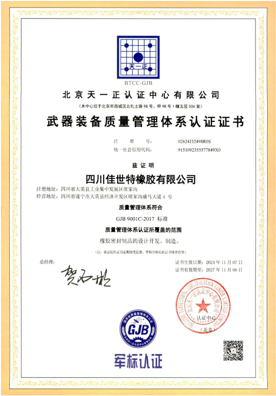 這一榮譽的獲得,對四川佳世特橡膠有限公司而言,意義非凡。它不僅代表了公司在產(chǎn)品質(zhì)量管理和技術(shù)創(chuàng)新方面的卓越能力,也彰顯了其在國家安全保障方面的重要貢獻。公司長期以來堅持高質(zhì)量發(fā)展道路,此次認證無疑是對其戰(zhàn)略定位的肯定和對技術(shù)實力的認可。