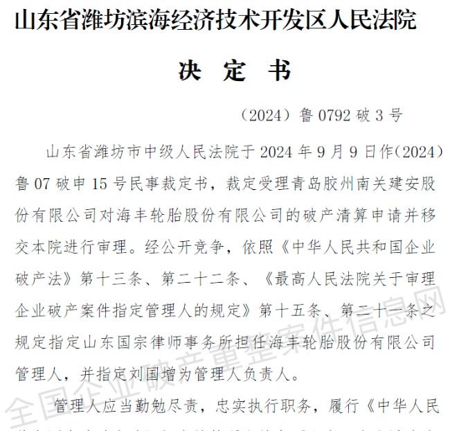 隨著程序的推進(jìn),山東省濰坊濱海經(jīng)濟(jì)技術(shù)開(kāi)發(fā)區(qū)人民法院在2024年11月1日發(fā)布了決定書(shū)(2024)魯0792破3號(hào),明確指定山東國(guó)宗律師事務(wù)所擔(dān)任海豐輪胎股份有限公司的管理人角色,并任命劉國(guó)增為管理人負(fù)責(zé)人,負(fù)責(zé)后續(xù)的相關(guān)事務(wù)處理。