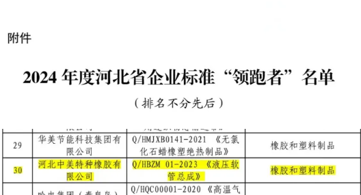 河北中美特種橡膠榮膺省級企業(yè)標(biāo)準(zhǔn)“領(lǐng)跑者”