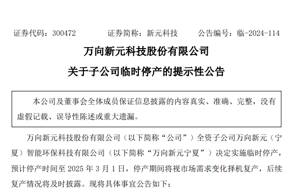 【炭黑產(chǎn)業(yè)網(wǎng)】12月5日消息,萬(wàn)向新元科技股份有限公司(以下簡(jiǎn)稱“萬(wàn)向新元”)近日宣布,其全資子公司萬(wàn)向新元(寧夏)智能環(huán)??萍加邢薰?簡(jiǎn)稱“萬(wàn)向新元寧夏”)將啟動(dòng)臨時(shí)停產(chǎn)計(jì)劃,預(yù)計(jì)此狀態(tài)將持續(xù)至2025年3月1日,停產(chǎn)期間將視市場(chǎng)需求變化擇機(jī)復(fù)產(chǎn)。