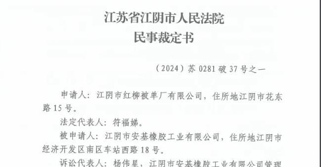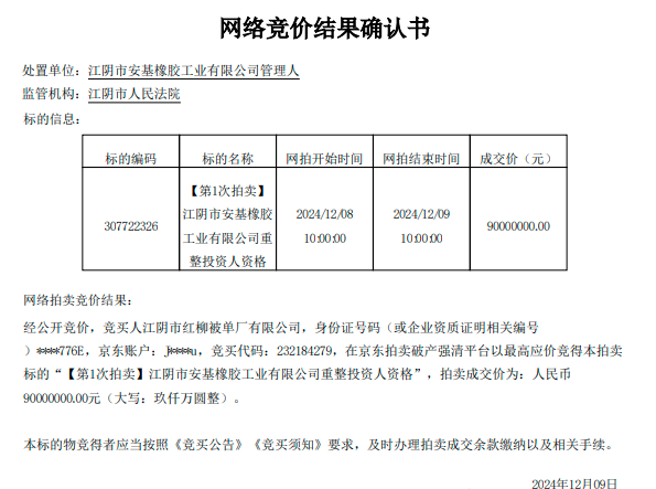 不久前,京東拍賣平臺(tái)發(fā)布一則資產(chǎn)重整信息,信息顯示江陰市安基橡膠工業(yè)有限公司招募投資人。近日,陰市安基橡膠工業(yè)有限公司重整投資人資格,拍賣成交。江陰市紅柳被單廠有限公司,以9000萬(wàn)元的價(jià)格競(jìng)得。至此,該公司成為重整投資人,并獲得安基橡膠100%股權(quán)。