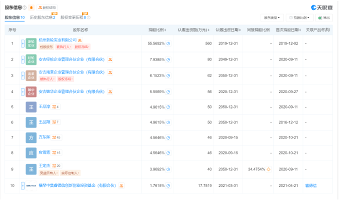 隨著此次股權(quán)凍結(jié)事件的曝光,天輪控股及其相關(guān)企業(yè)的股權(quán)結(jié)構(gòu)也浮出水面。據(jù)公開資料顯示,杭州浙輪實(shí)業(yè)有限公司為天輪控股的第一大股東,持股比例高達(dá)55.569%。而安吉經(jīng)輪企業(yè)管理合伙企業(yè)(有限合伙)、安吉南萊企業(yè)管理合伙企業(yè)(有限合伙)以及安吉敏華企業(yè)管理合伙企業(yè)(有限合伙)則分別持有7.9385%、6.1523%和5.5569%的股份。