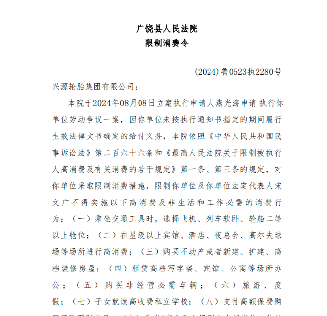 近日,廣饒縣人民法院針對興源輪胎集團有限公司(以下簡稱興源輪胎”)及其法定代表人宋文廣發(fā)布了限制消費令,案號為(2024)魯0523執(zhí)2280號。