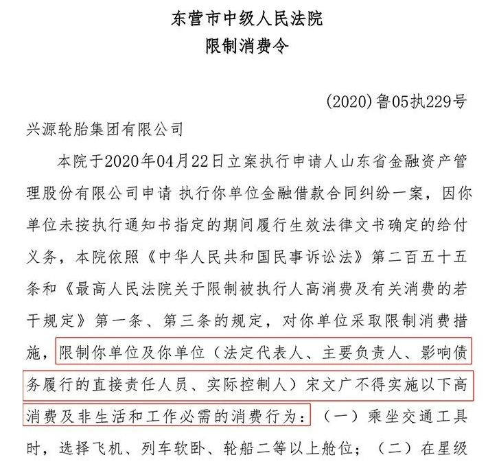 早在2020年4月27日,東營市中級人民法院發(fā)布了一條公告,2020年4月22日山東金融資產管理有限公司申請執(zhí)行星園集團金融借款合同一案,興源集團總經理法定代表人被限制高消費。包括乘坐交通工具、住酒店、購買樓房、租賃場所、子女讀私立高收費學校等等。