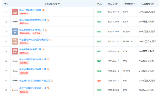 2024年11月6日,廣豐橡膠輪胎有限公司500萬人民幣被凍結;2024年10月30日,東營銀行股份有限公司100萬人民幣被凍結;2024年3月27日,山東歐美雅化學有限公司9990萬人民幣被凍結等等等等。