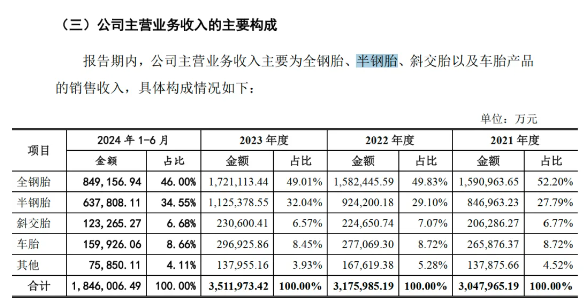 近年來(lái),全鋼胎為公司貢獻(xiàn)了穩(wěn)定的收入。2021年至2023年及2024年上半年,全鋼胎為公司分別帶來(lái)159.1億元、158.24億元、172.11億元和84.92億元,占總營(yíng)收的比例逐年略降,從52.2%降至46%。