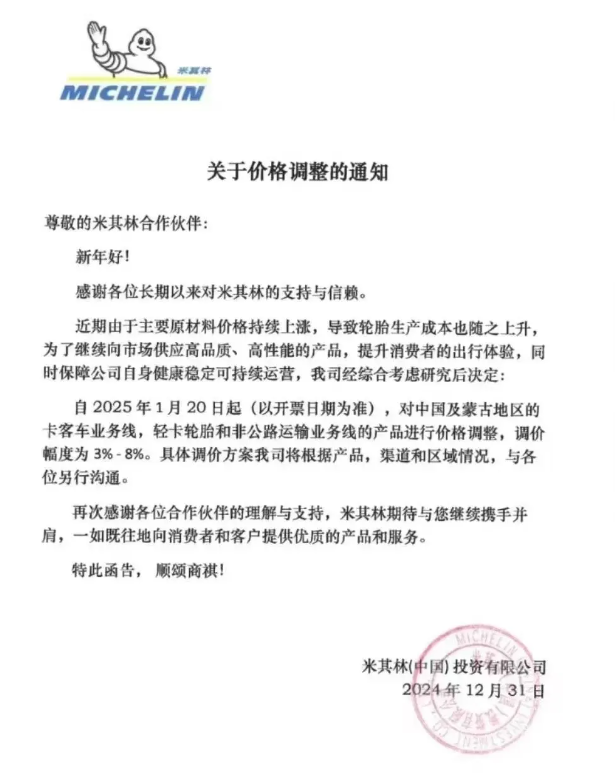 米其林輪胎宣布價(jià)格調(diào)整,漲幅3%-8%!