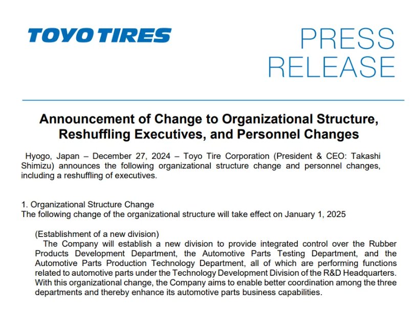 東洋輪胎宣布重大組織調(diào)整,加速汽車零部件業(yè)務發(fā)展