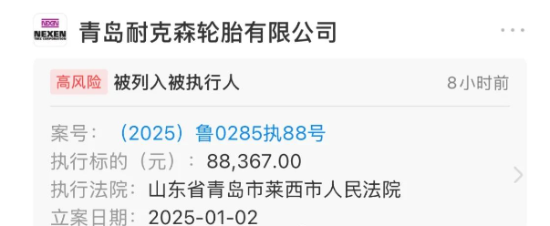 【炭黑產(chǎn)業(yè)網(wǎng)】1月3日消息,近日,青島耐克森輪胎有限公司因法律糾紛問題,被山東省青島市萊西市人民法院納入被執(zhí)行人名單,案號顯示為(2025)魯0285執(zhí)88號,執(zhí)行標的金額達88367元,且該案件于2025年1月2日正式立案。耐克森,這一源自韓國的輪胎制造品牌,在國內(nèi)的產(chǎn)品大多出自青島工廠。