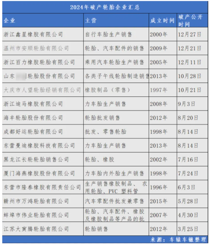 2024年,15家輪胎企業(yè)破產(chǎn)倒閉