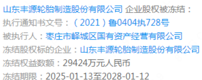 山東一輪胎公司股權(quán)凍結(jié),凍結(jié)期限至2028年