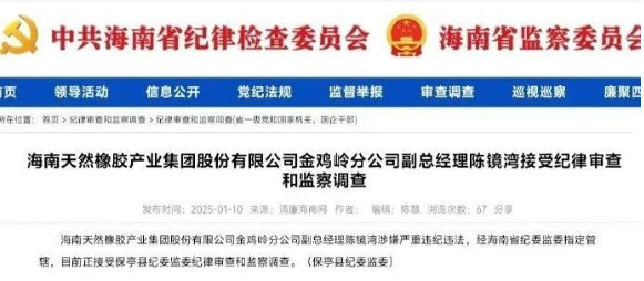 1月10日,海南天然橡膠產(chǎn)業(yè)集團股份有限公司金雞嶺分公司副總經(jīng)理陳鏡灣涉嫌嚴重違紀違法,經(jīng)海南省紀委監(jiān)委指定管轄,目前正接受海南省保亭縣紀委監(jiān)委紀律審查和監(jiān)察調(diào)查。