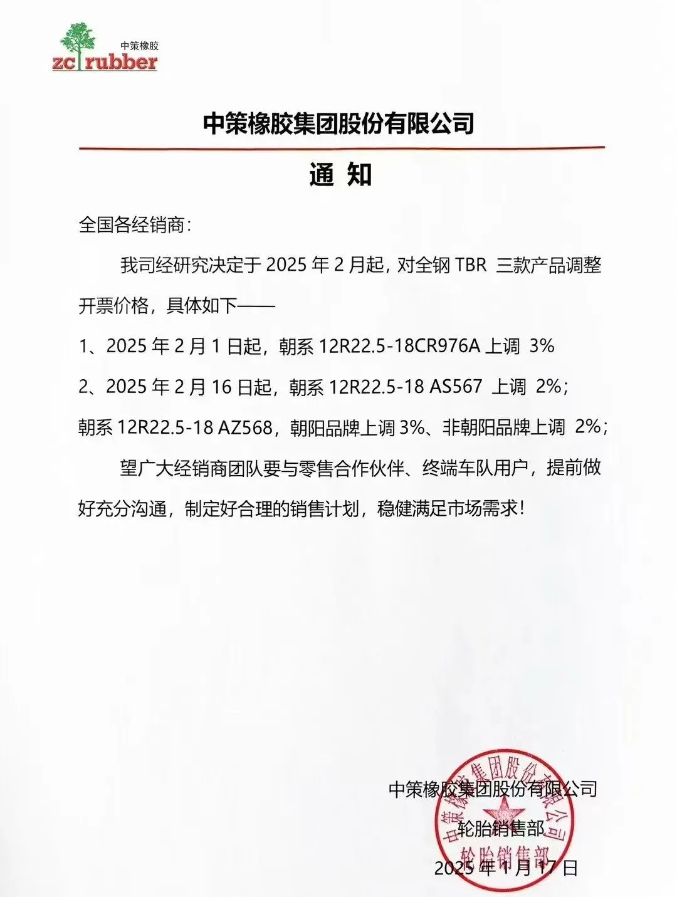 2025年1月17日,中策橡膠集團(tuán)股份有限公司決定從2025年2月起,對(duì)全鋼TBR三款產(chǎn)品調(diào)整開票價(jià)格。
