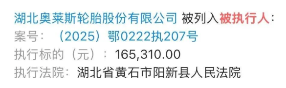 湖北奧萊斯輪胎股份有限公司被列入被執(zhí)行人,執(zhí)行法院為湖北省黃石市陽新縣人民法院,執(zhí)行標的達165310元。