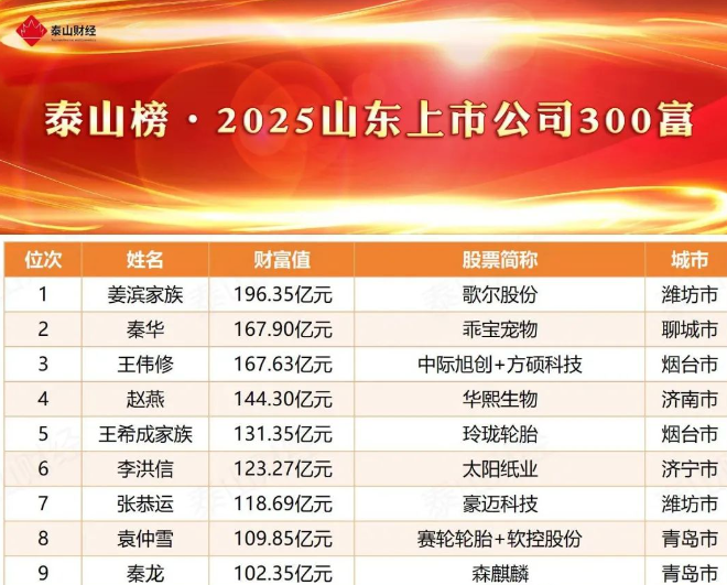 【炭黑產(chǎn)業(yè)網(wǎng)】2月6日消息,山東輪胎行業(yè)再度迎來榮耀時刻,《泰山榜·2025山東上市公司300富》榜單揭曉,輪胎界的精英們紛紛嶄露頭角。其中,玲瓏輪胎的王希成家族、賽輪輪胎的掌舵人袁仲雪,以及森麒麟的領軍者秦龍,均以超越百億的財富彰顯了山東輪胎業(yè)的非凡實力與市場號召力。
