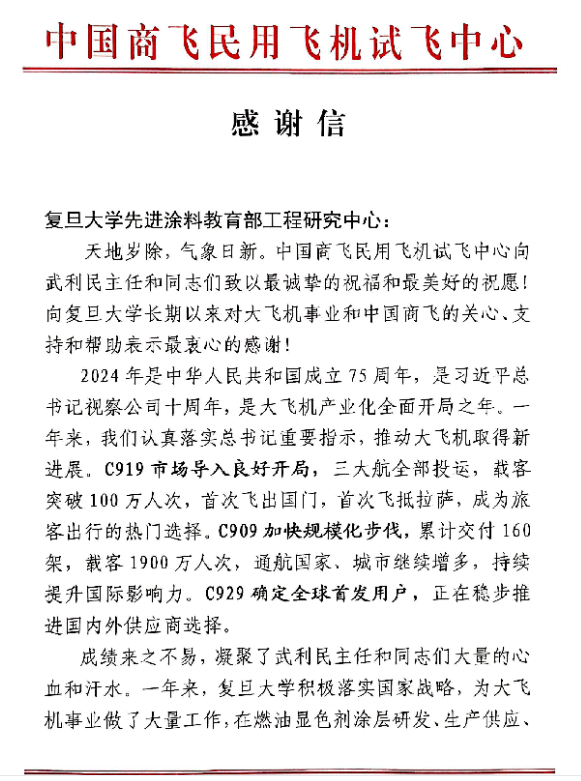 近日,復(fù)旦大學(xué)官網(wǎng)報道了中國商飛民用飛機試飛中心向復(fù)旦大學(xué)先進涂料教育部工程研究中心發(fā)來感謝信的新聞。信中對研究中心在飛機燃油檢測技術(shù)領(lǐng)域的卓越貢獻表示高度認可和由衷感謝。這是繼2024年6月,該團隊榮獲國家技術(shù)發(fā)明獎二等獎后,半年內(nèi)再次獲得重大工程的重要肯定!