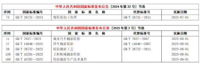 【炭黑產(chǎn)業(yè)網(wǎng)】2月13日消息,為積極響應(yīng)國(guó)家提升牽引設(shè)備更新、促進(jìn)消費(fèi)的政策號(hào)召,全國(guó)輪胎輪輞標(biāo)準(zhǔn)化技術(shù)委員會(huì)在2024年積極行動(dòng),制修訂了6項(xiàng)關(guān)鍵性國(guó)家標(biāo)準(zhǔn),旨在完善廢舊輪胎綜合利用的標(biāo)準(zhǔn)體系。這些標(biāo)準(zhǔn)包括GB/T 26731—2024《廢輪胎加工處理技術(shù)規(guī)范》、GB/T 45292—2025《輪胎翻新生產(chǎn)基本條件》、GB/T 26732—2025《輪胎翻新工藝流程》、GB/T 14646—2025《轎車(chē)翻新輪胎質(zhì)量標(biāo)準(zhǔn)》、GB/T 7037—2025《載重汽車(chē)翻新輪胎規(guī)范》以及GB/T 45291—2025《工程機(jī)械翻新輪胎要求》。近日,這6項(xiàng)國(guó)家標(biāo)準(zhǔn)已正式發(fā)布(詳見(jiàn)中華人民共和國(guó)國(guó)家標(biāo)準(zhǔn)發(fā)布公告〔2024第32號(hào)〕及〔2025第2號(hào)〕)。