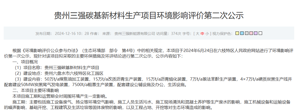 貴州三強(qiáng)碳基新材料項目環(huán)評二次公示