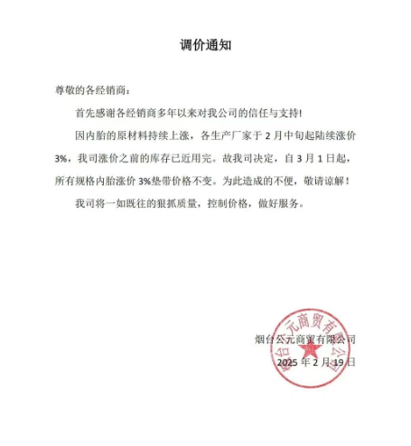 【炭黑產(chǎn)業(yè)網(wǎng)】2月20日消息,近日,煙臺公元商貿(mào)有限公司發(fā)布通知,自3月1日起,將對所有規(guī)格的輪胎價(jià)格上調(diào)3%。此次漲價(jià)旨在應(yīng)對近期原材料價(jià)格的大幅攀升,以確保公司能夠繼續(xù)保持產(chǎn)品質(zhì)量和服務(wù)水平,為客戶提供優(yōu)質(zhì)的產(chǎn)品和服務(wù)。