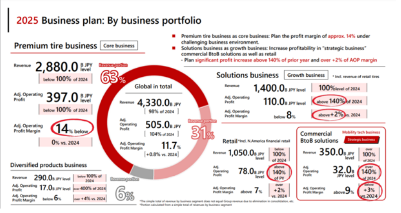 據(jù)炭黑產(chǎn)業(yè)網(wǎng)了解,除了高端產(chǎn)品戰(zhàn)略外,普利司通還在全球采購、供應(yīng)鏈管理及生產(chǎn)效率方面實施了一系列成本節(jié)約措施。這些措施在2024年已幫助公司節(jié)省了750億日元,并預(yù)計在今年再削減300億日元成本,與2023年相比,總節(jié)省額將達到1050億日元。這一效率提升計劃是該輪胎橡膠巨頭自2021年啟動的為期10年的全面重組計劃的“第二階段”組成部分。