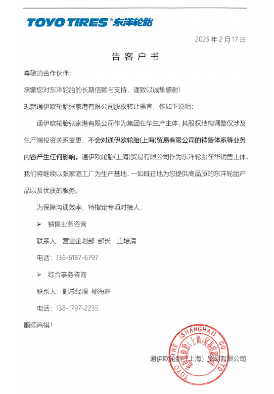 通伊歐輪胎上海貿(mào)易公司隨后發(fā)出了關(guān)于張家港公司股權(quán)轉(zhuǎn)讓事宜的告知書。告知書表示,通伊歐輪胎張家港有限公司作為集團(tuán)在華生產(chǎn)主體,其股權(quán)結(jié)構(gòu)調(diào)整僅涉及生產(chǎn)端投資關(guān)系變更,不會對通伊歐輪胎(上海)貿(mào)易有限公司的銷售體系等業(yè)務(wù)內(nèi)容產(chǎn)生任何影響。