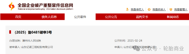 近日,全國(guó)企業(yè)破產(chǎn)重整案件信息網(wǎng)公開(kāi)了山東億諾工程輪胎有限公司的破產(chǎn)審查案件。