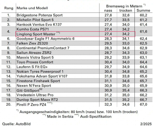 【炭黑產(chǎn)業(yè)網(wǎng)】2月26日消息,玲瓏輪胎再度驚艷整個(gè)行業(yè)。最新公布的2025年《AutoBild》夏季輪胎測(cè)試預(yù)賽結(jié)果顯示,玲瓏輪胎的SPORT MASTER以非凡性能榮登預(yù)賽榜單第四位,在所有參與測(cè)試的中國(guó)品牌中獨(dú)占鰲頭。