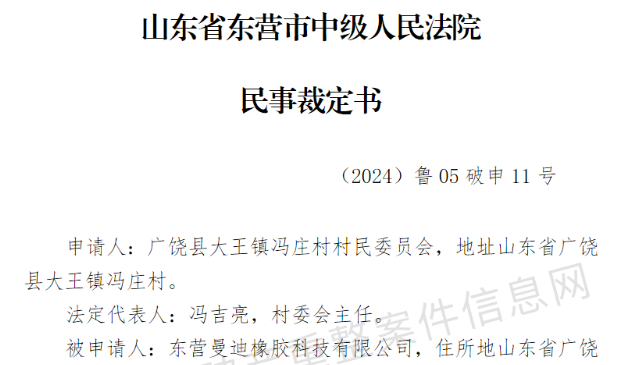 山東省東營市中級人民法院發(fā)布了關(guān)于東營曼迪橡膠科技有限公司的民事裁定書。