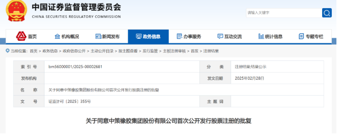 近日,中國證監(jiān)會官網(wǎng)公示一則重磅消息:中策橡膠集團股份有限公司首次公開發(fā)行股票的注冊申請正式獲批!具體批復(fù)內(nèi)容如下: