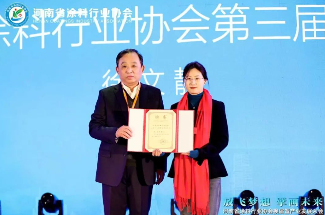 大會舉行了隆重的授牌儀式,分別為第三屆會長單位、常務副會長單位、副會長單位頒發(fā)牌匾,并為河南臥龍涂料科技有限公司董事會主席李國報頒發(fā)協(xié)會第三屆名譽會長證書,為徐文靜頒發(fā)協(xié)會第三屆秘書長聘書。