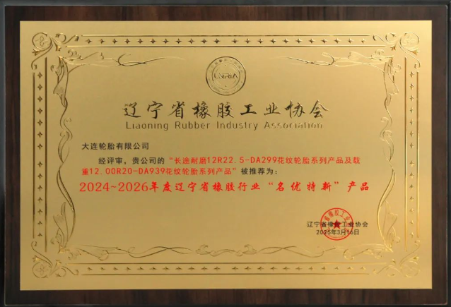 大連輪胎兩款產(chǎn)品榮獲遼寧省橡膠行業(yè)“名優(yōu)特新”稱(chēng)號(hào)