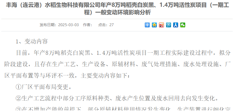 【炭黑產(chǎn)業(yè)網(wǎng)】3月24日消息,豐海(連云港)水稻生物科技有限公司宣布對(duì)其年產(chǎn)8萬(wàn)噸稻殼白炭黑及1.4萬(wàn)噸活性炭項(xiàng)目實(shí)施方案進(jìn)行調(diào)整。