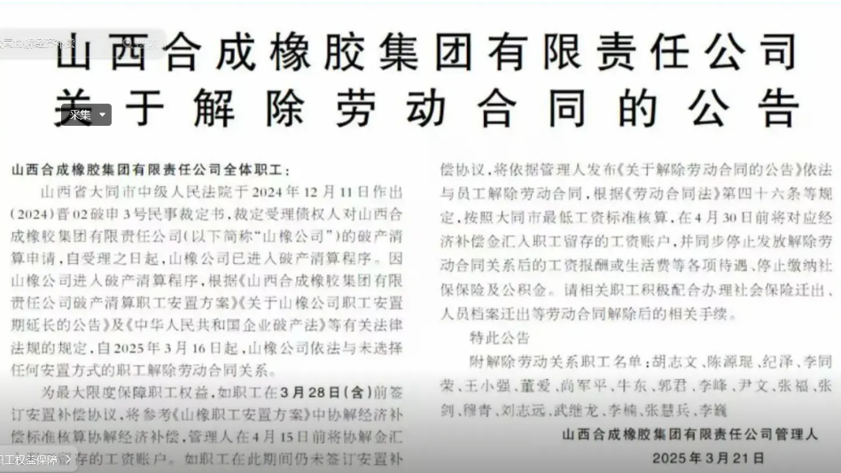 【炭黑產(chǎn)業(yè)網(wǎng)】3月27日消息,近日,在網(wǎng)上流傳著一張有關(guān)山西合成橡膠集團(tuán)有限責(zé)任公司解除勞動合同的公告的圖片。