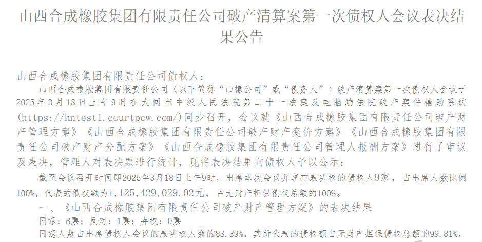3月26日,山西合成橡膠集團(tuán)有限責(zé)任公司破產(chǎn)清算案第一次債權(quán)人會議表決結(jié)果公示。