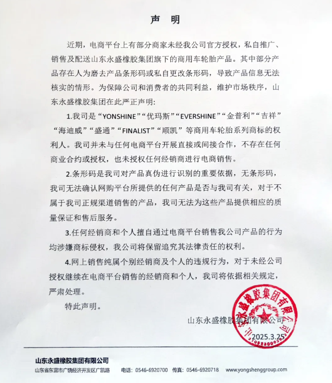 近日,山東永盛橡膠集團(tuán)有限公司針對部分電商平臺未經(jīng)授權(quán)銷售旗下商用車輪胎產(chǎn)品的行為發(fā)布嚴(yán)正聲明。