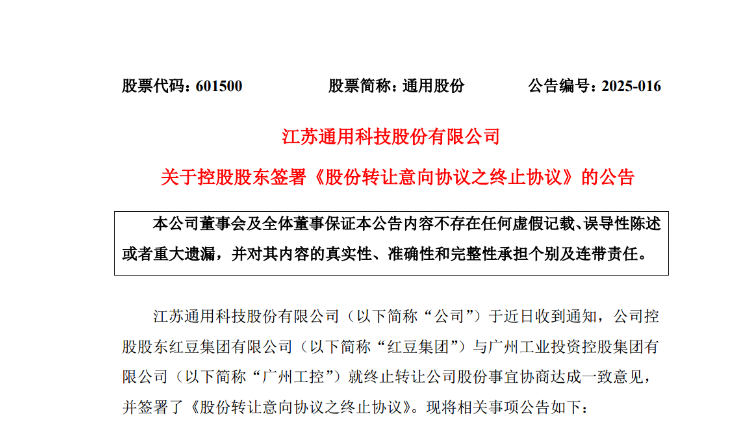 【炭黑產(chǎn)業(yè)網(wǎng)】3月28日消息,近日,通用股份發(fā)布了一則重要公告,稱其控股股東紅豆集團(tuán)與廣州工業(yè)投資控股集團(tuán)有限公司之間的股份轉(zhuǎn)讓意向協(xié)議已經(jīng)終止。這一變故發(fā)生在雙方簽署轉(zhuǎn)讓意向協(xié)議兩個多月后,原本廣州工控有意通過受讓紅豆集團(tuán)所持通用股份的部分股權(quán),從而成為通用股份的新主人。然而,由于客觀情況的變化,雙方經(jīng)協(xié)商一致,決定終止原協(xié)議,并簽署了《股份轉(zhuǎn)讓意向協(xié)議之終止協(xié)議》。