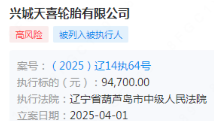 據(jù)法院發(fā)布的執(zhí)行信息顯示,興城天喜輪胎有限公司因與北方測(cè)盟(葫蘆島)科技有限公司的國(guó)內(nèi)非涉外仲裁裁決案件,被遼寧省葫蘆島市中級(jí)人民法院列入被執(zhí)行人名單。案件案號(hào)為(2025)遼14執(zhí)64號(hào),立案日期為2025年4月1日。