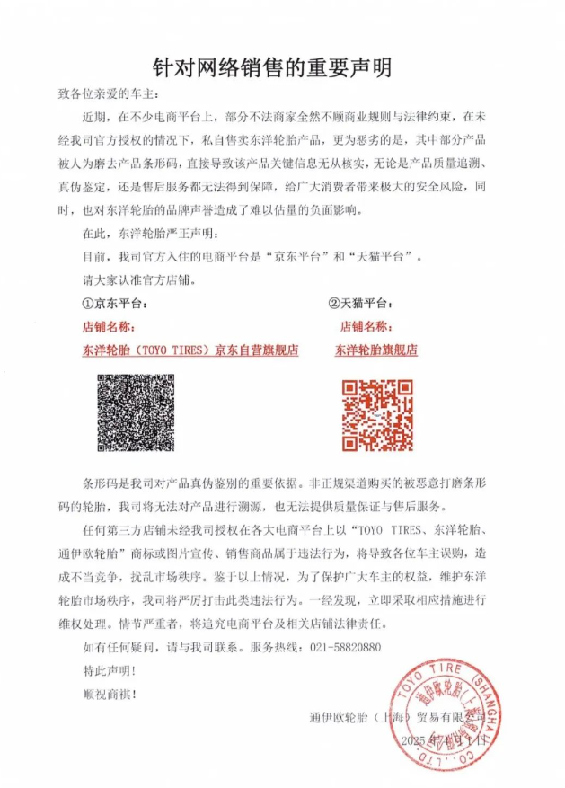 針對這一嚴(yán)峻形勢,東洋輪胎官方鄭重聲明,目前公司官方認(rèn)可并入駐的電商平臺僅有“京東平臺”和“天貓平臺”。消費者在購買東洋輪胎產(chǎn)品時,應(yīng)選擇正規(guī)渠道,以確保產(chǎn)品質(zhì)量和售后服務(wù)得到保障。對于非正規(guī)渠道購買的、被惡意打磨條形碼的輪胎,公司將無法提供溯源服務(wù),也無法給予質(zhì)量保證和售后支持。
