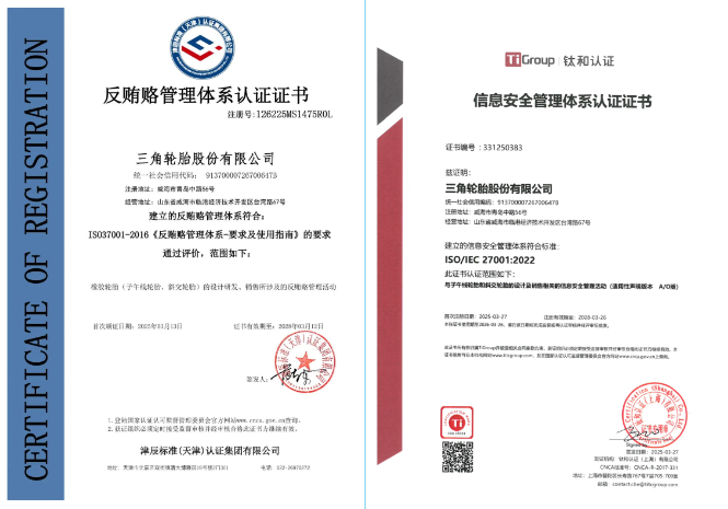 【炭黑產(chǎn)業(yè)網(wǎng)】4月14日消息,近日,三角輪胎股份有限公司正式宣布,公司已順利通過(guò)ISO 27001信息安全管理體系認(rèn)證及ISO 37001反賄賂管理體系認(rèn)證,這一里程碑式的成就標(biāo)志著其在信息安全與商業(yè)合規(guī)領(lǐng)域?qū)崿F(xiàn)了質(zhì)的飛躍。兩大國(guó)際認(rèn)證的獲得,不僅是對(duì)公司長(zhǎng)期以來(lái)堅(jiān)持規(guī)范化管理、強(qiáng)化風(fēng)險(xiǎn)防控能力的權(quán)威認(rèn)可,更為其未來(lái)的可持續(xù)發(fā)展奠定了堅(jiān)實(shí)基礎(chǔ)。