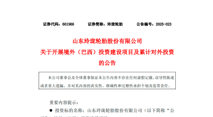 【炭黑產(chǎn)業(yè)網(wǎng)】4 月 29 日消息,2025 年 4 月 25 日,山東玲瓏輪胎股份有限公司發(fā)布了一則關(guān)于開展境外 (巴西) 投資建設(shè)項(xiàng)目及累計(jì)對(duì)外投資的重要公告。公告顯示,玲瓏輪胎計(jì)劃斥巨資在巴西打造新的產(chǎn)業(yè)基地,以進(jìn)一步提升自身在國(guó)際市場(chǎng)的競(jìng)爭(zhēng)力,穩(wěn)步推進(jìn)其 “7+5” 戰(zhàn)略布局。