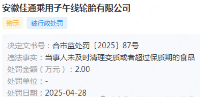 2025年4月28日,安徽佳通乘用子午線輪胎有限公司因食品安全問題被合肥市市場監(jiān)督管理局處罰。