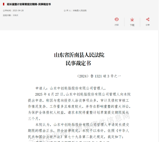 近日,全國企業(yè)破產(chǎn)重整案件信息網(wǎng)發(fā)布延長重整計(jì)劃草案提交期限民事裁定書,山東中創(chuàng)輪胎股份有限公司管理人向本院提出申請(qǐng),稱因與意向投資人洽談事項(xiàng)眾多,審計(jì)及債權(quán)審核工作情況復(fù)雜、工作量多且難度較大,并存在影響重整的重大訴訟,為保護(hù)全體債權(quán)人權(quán)益,請(qǐng)求本院將重整計(jì)劃草案提交期限延長三個(gè)月。
