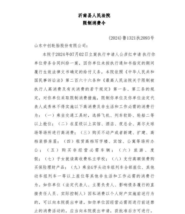 法院限制消費(fèi)令顯示,2024年7月2日立案執(zhí)行申請(qǐng)人公彥紅申請(qǐng)執(zhí)行山東中創(chuàng)輪胎股份有限公司勞動(dòng)合同糾紛一案。因山東中創(chuàng)輪胎股份有限公司未按執(zhí)行通知書指定的期間履行生效法律文書確定的給付義務(wù),沂南縣人民法院依照《中華人民共和國民事訴訟法》第二百六十六條和《最高人民法院關(guān)于限制被執(zhí)行人高消費(fèi)及有關(guān)消費(fèi)的若干規(guī)定》第一條、第三條的規(guī)定,對(duì)山東中創(chuàng)輪胎股份有限公司采取限制消費(fèi)措施,限制山東中創(chuàng)輪胎股份有限公司及山東中創(chuàng)輪胎股份有限公司法定代表人成秀林不得實(shí)施以下高消費(fèi)及非生活和工作必需的消費(fèi)行為。