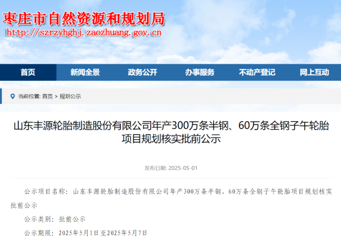 【炭黑產(chǎn)業(yè)網(wǎng)】5 月 7 日消息,近日,山東豐源輪胎制造股份有限公司迎來(lái)重要進(jìn)展。山東省棗莊市自然資源和規(guī)劃局于 5 月 1 日對(duì)外發(fā)布公示,對(duì)豐源輪胎年產(chǎn) 300 萬(wàn)條半鋼、60 萬(wàn)條全鋼子午輪胎項(xiàng)目開(kāi)展規(guī)劃核實(shí)批前公示,此次公示將持續(xù)至 5 月 7 日結(jié)束。