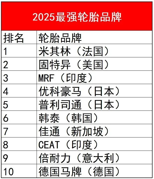 近日,國外媒體發(fā)布了《2025年全球輪胎品牌價(jià)值與實(shí)力排行榜》在新能源汽車普及加速、綠色技術(shù)迭代的產(chǎn)業(yè)背景下,這份榜單不僅揭示了行業(yè)格局的深刻變化,更展現(xiàn)了中國品牌的突破性成長。
