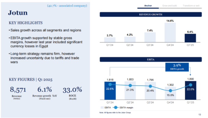 【炭黑產(chǎn)業(yè)網(wǎng)】5 月 12 日消息, 2025 年第一季度業(yè)績(jī)報(bào)告顯示,全球知名涂料企業(yè)佐敦表現(xiàn)出色,特別是在中國(guó)市場(chǎng),成為拉動(dòng)業(yè)績(jī)的重要力量。佐敦的大股東奧克拉 (Orkla) 于 5 月 9 日發(fā)布了這份業(yè)績(jī)報(bào)告。