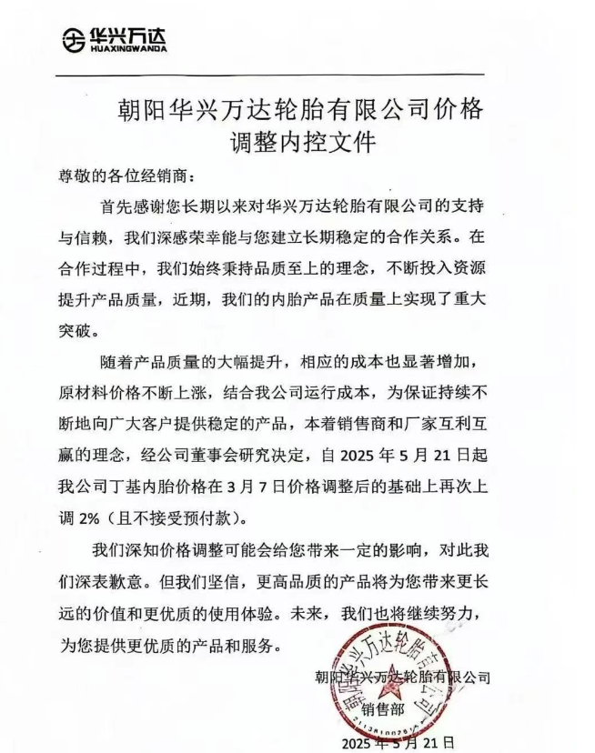 【炭黑產業(yè)網】5月21日消息,國內輪胎行業(yè)領軍企業(yè)朝陽華興萬達輪胎有限公司近日正式對外發(fā)布公告,宣布自2025年5月21日起,對旗下丁基內胎產品實施價格上調策略,調整幅度為2%,同時明確表示此次調價不接受預付款訂單。此舉立即引發(fā)了業(yè)界的廣泛關注。