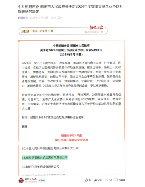 蟬聯(lián)“朝陽市突出貢獻(xiàn)企業(yè)”榮譽(yù)稱號是朝陽市委、市政府對朝陽黑貓過去一年工作的充分肯定,也是對公司未來發(fā)展的重要激勵。朝陽黑貓將以此為契機(jī),不斷提升企業(yè)核心競爭力,為朝陽振興發(fā)展貢獻(xiàn)黑貓力量!